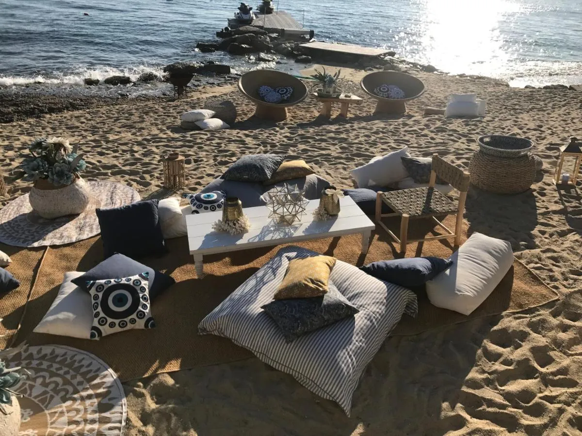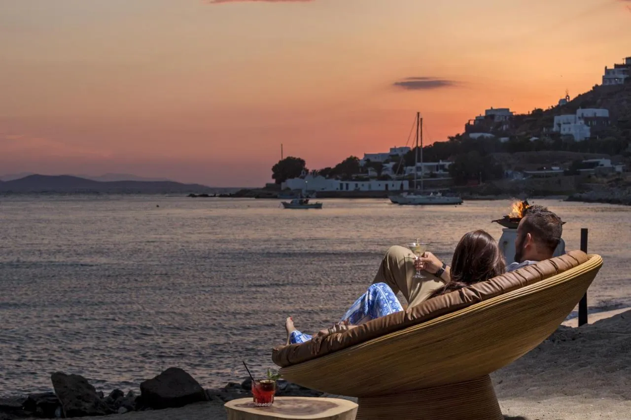 Hippie Chic Hotel’s prime beachfront location provides direct access to the golden sands of Agios Ioannis Beach, where a private beach area awaits with luxurious loungers and attentive service.