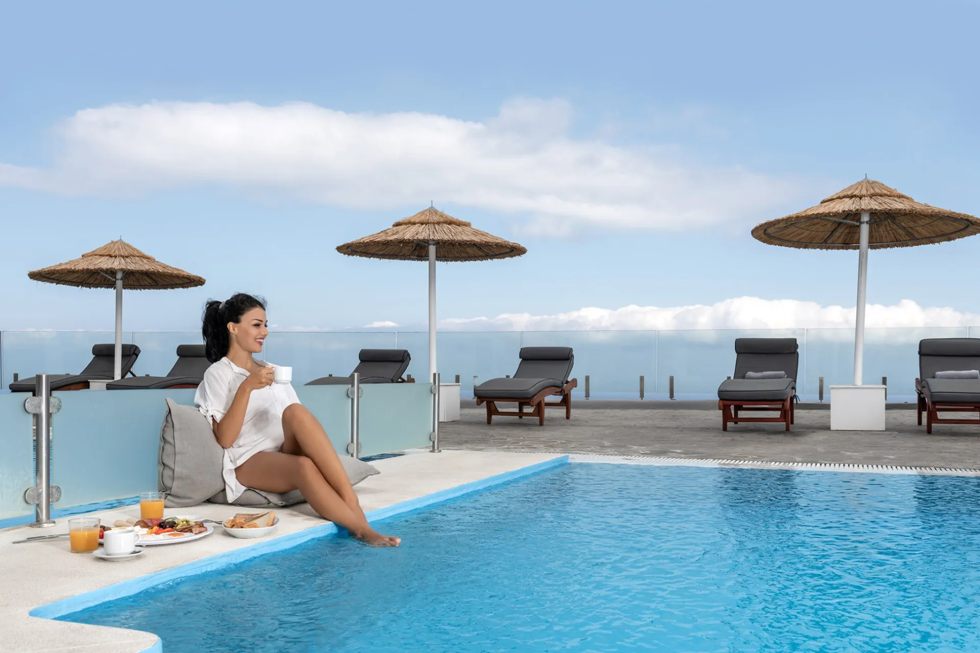 Swimming Pool: A stylish pool with sun umbrellas and panoramic views.