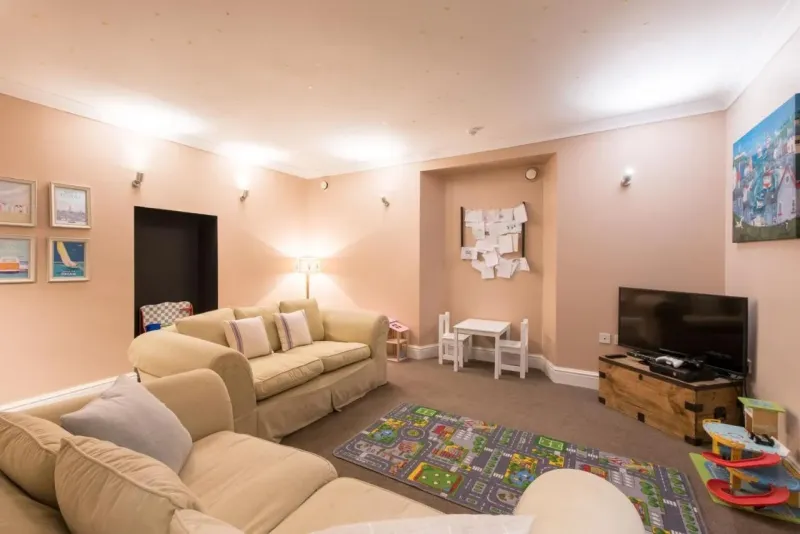 The property boasts an indoor swimming pool, perfect for a refreshing dip regardless of the weather. A dedicated drawing room offers a peaceful retreat for adults, while the adjacent playroom keeps younger guests entertained.